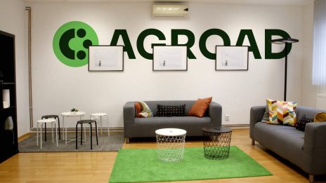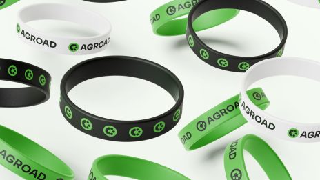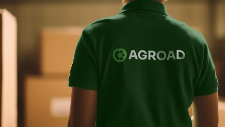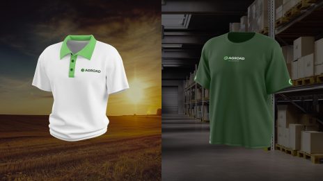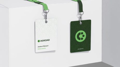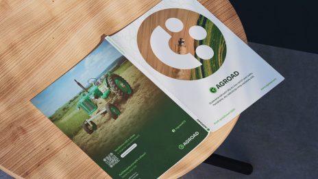 Ukázka vizuálního stylu značky AGROAD. Představuje využití logotypu a kombinace barev i písma v praxi.
