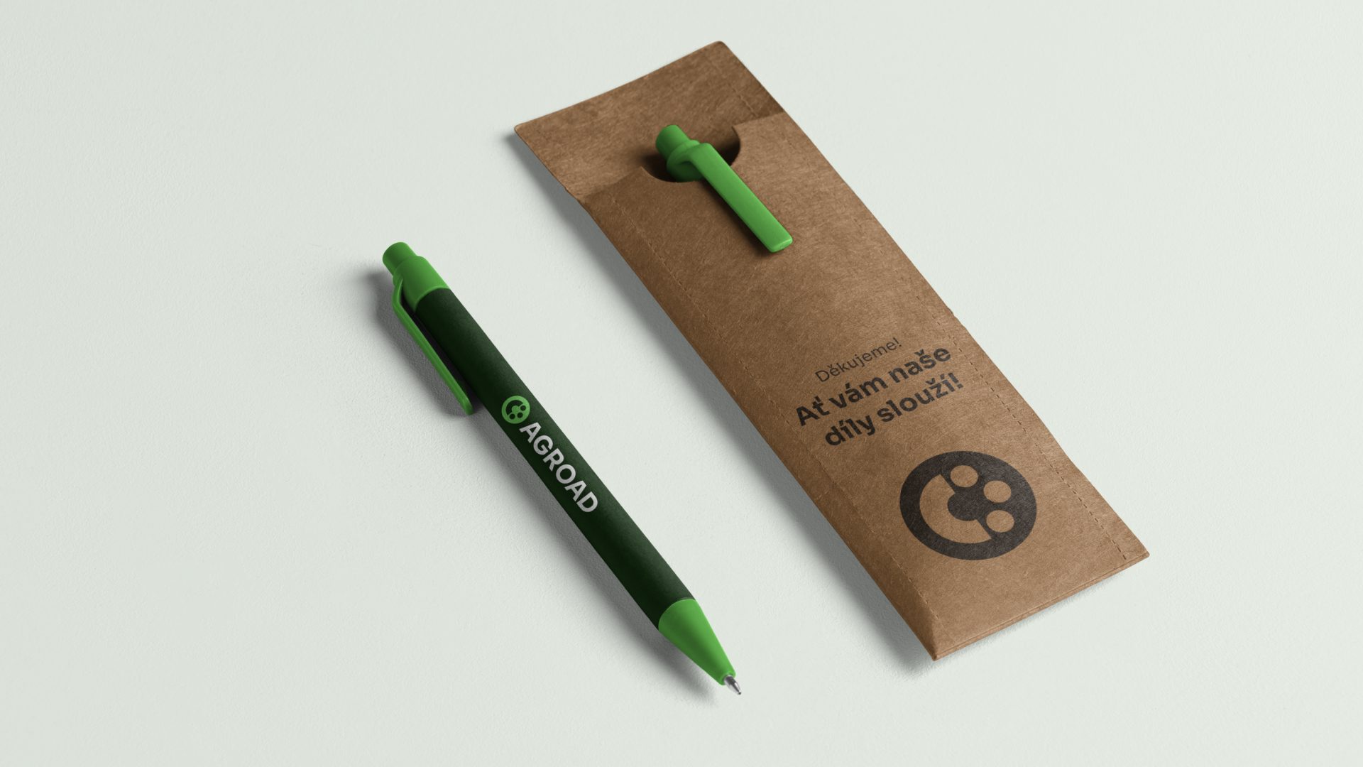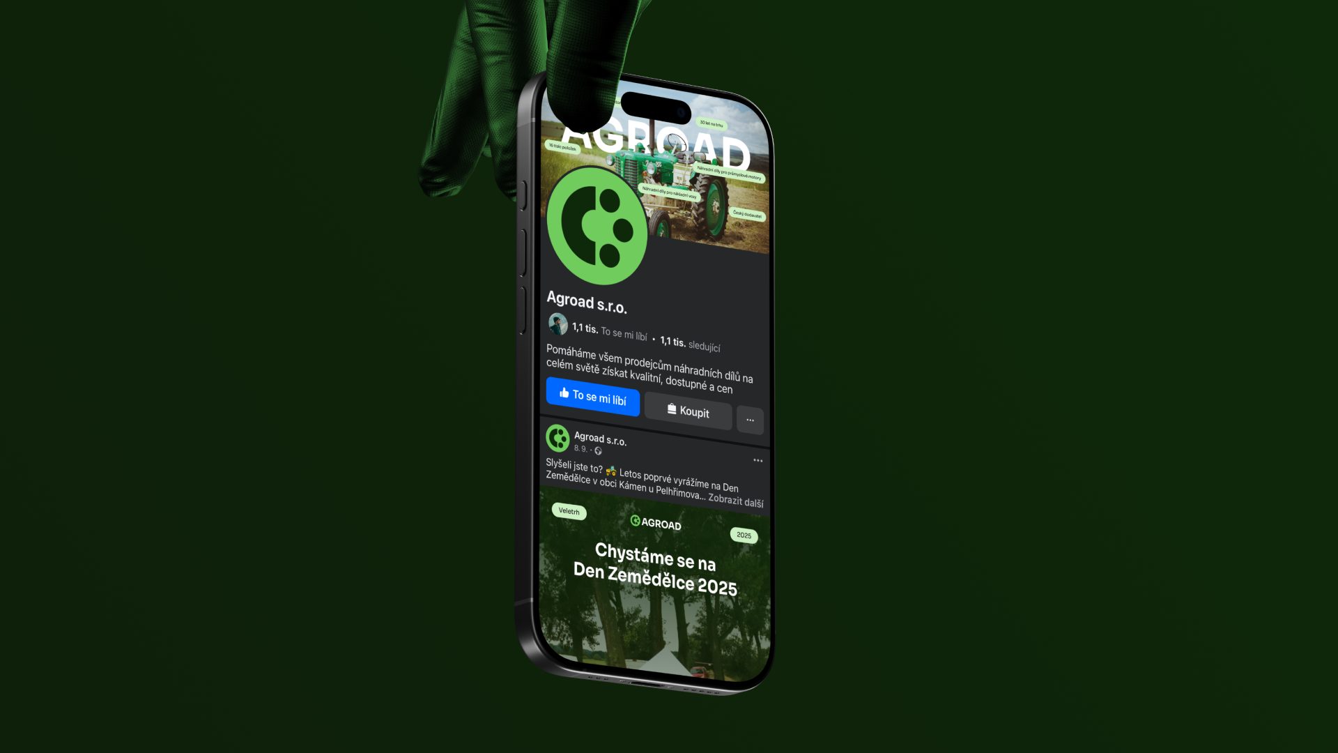 Ukázka vizuálního stylu značky AGROAD. Představuje využití logotypu a kombinace barev i písma v praxi.